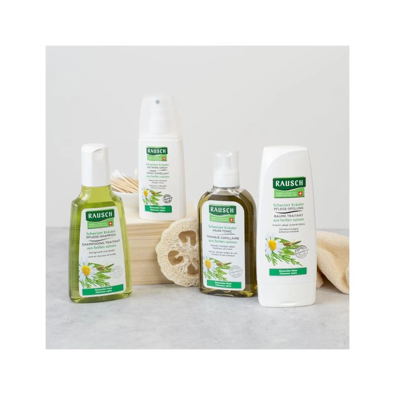 La LINEA TRATTANTE alle erbe svizzere di RAUSCH con estratti purissimi di erbe svizzere rivitalizza il cuoio capelluto e si prende cura dei capelli, donando loro una lucentezza naturale.