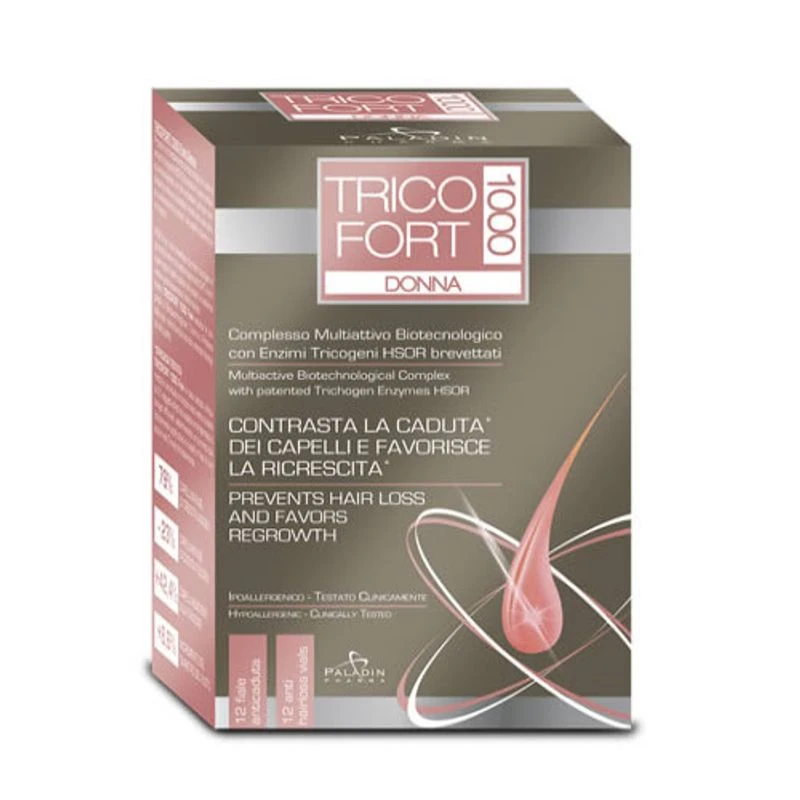 TRICOFORT 1000 DONNA fiale cosmetiche propone un trattamento biotecnologico a base di Enzimi Tricogeni HSOR, Nucleotidi e Lisato batterico antiossidante.